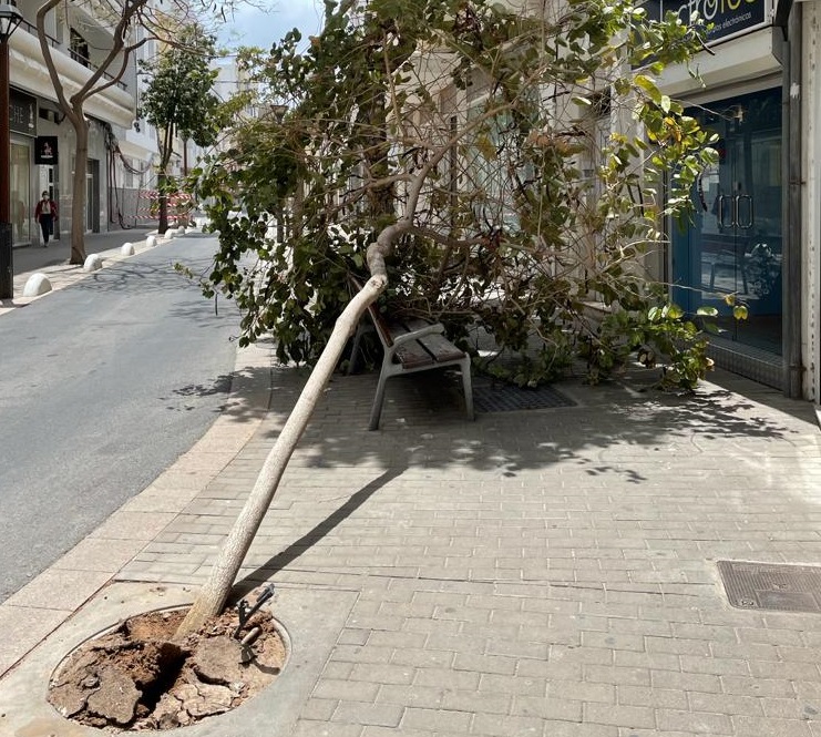 El Consorcio de Seguridad y Emergencias tuvo que intervenir. En el caso del árbol, cortándolo con una motosierra para retirarlo de la acera y en el caso de las palmeras de la Calle Triana, ascendiendo con una grúa para retirar las que se encontraban parcialmente sueltas.