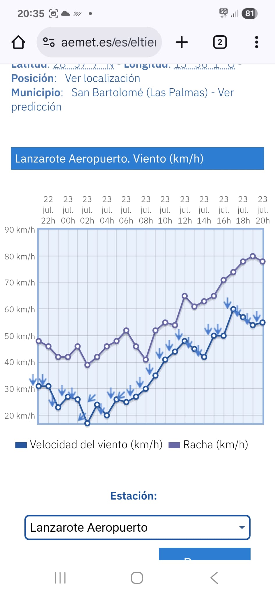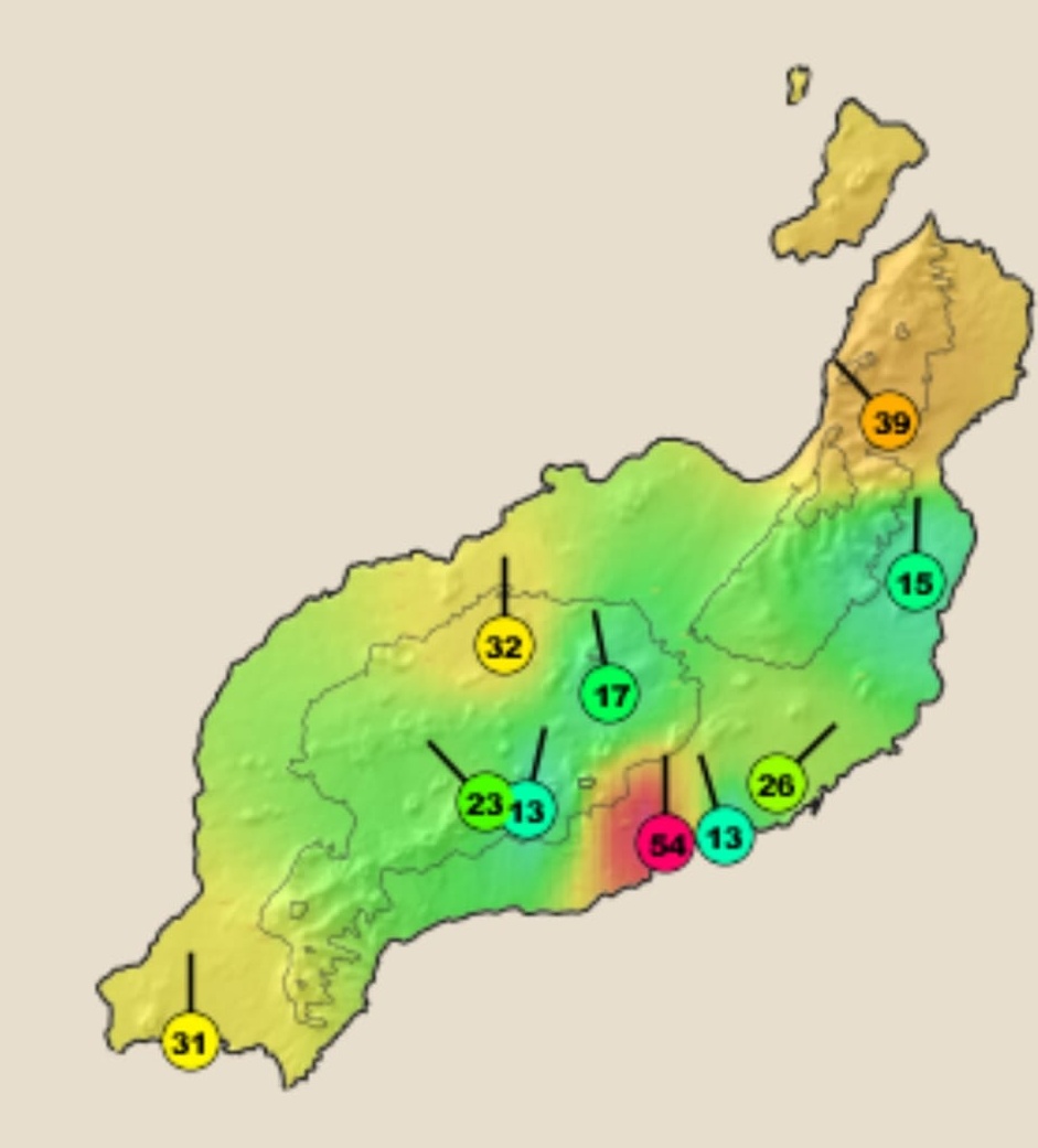 Aunque no fue la localidad con rachas de viento más fuertes, sí que fue la más incidentes contempló. Las rachas más violentas se registraron en muchas zonas de la isla hacia las cuatro o las cinco de la mañana. Está previsto que a lo largo de la jornada de hoy persista la alerta por viento hasta las seis de la tarde.