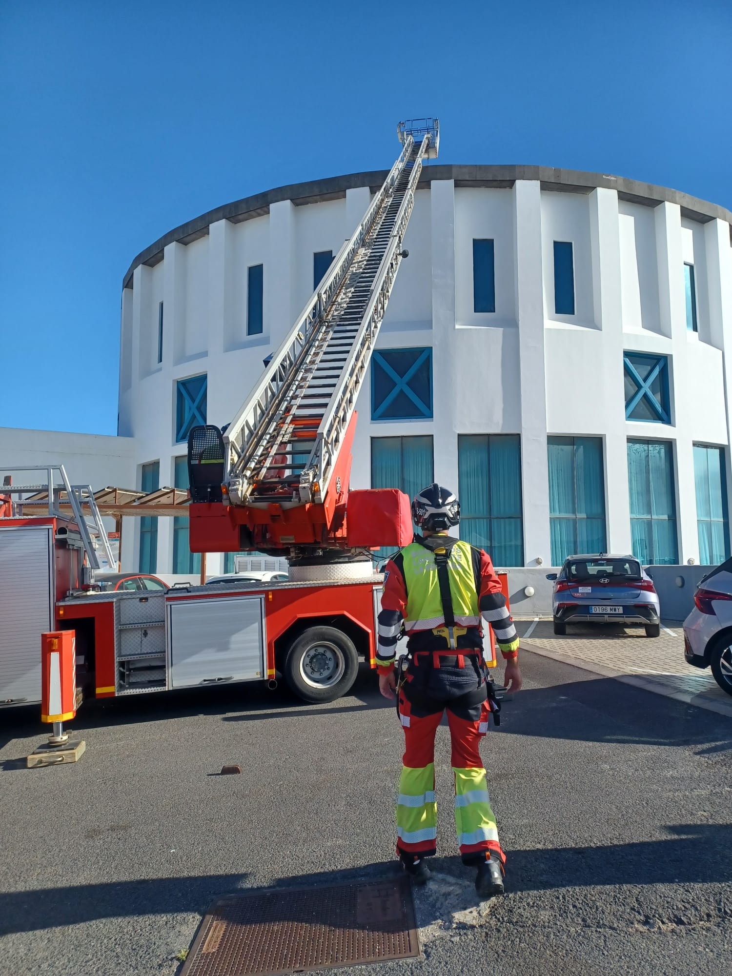 Poco después, fueron alertados por la posible caída de unas planchas de metacrilato de la cúpula del Hotel Beach Papagayo de Playa Blanca. Se procedió con ayuda de la autoescala a acceder a la cúpula y fijar las planchas que estaban sueltas.