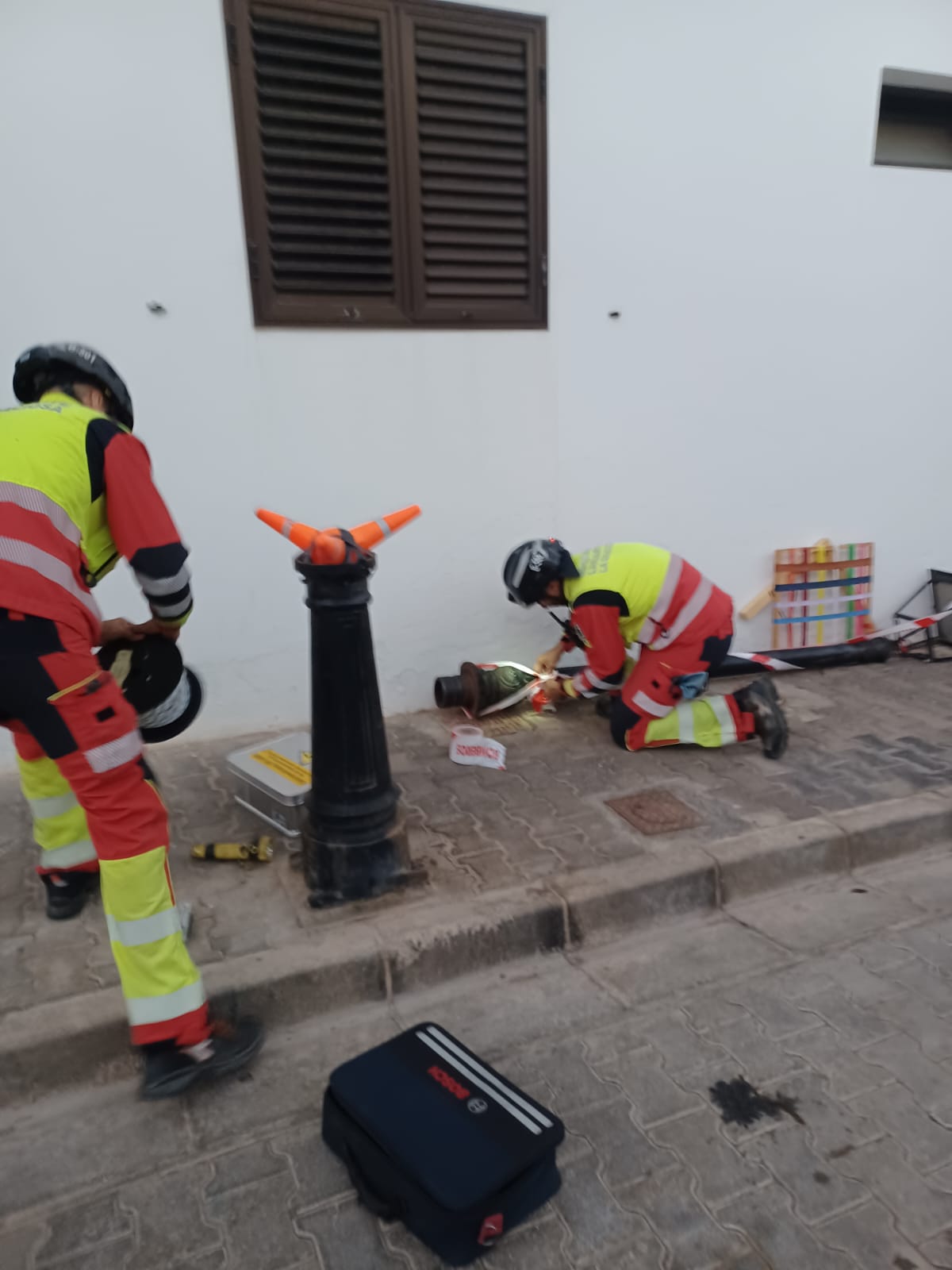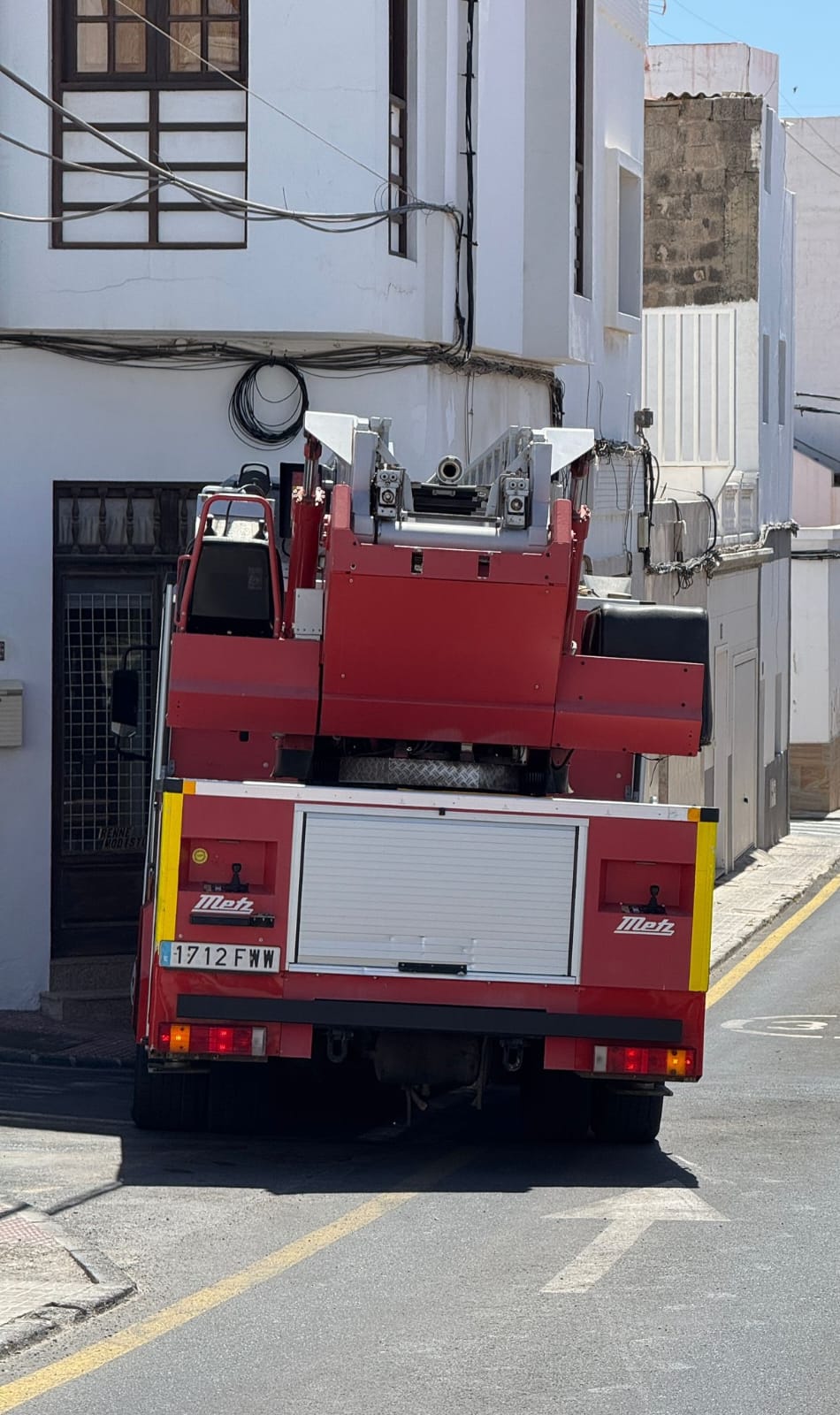 El siguiente aviso los llevó hasta Montaña Roja, también en Playa Blanca, debido a la caída de una palmera por el fuerte viento, que se balizó con cinta. También en Playa Blanca, en la calle El Calamar, el viento tiró prácticamente al suelo una farola que tuvo que ser desconectada y retirada, dejando la base balizada.