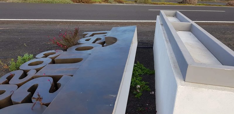 Operarios municipales de Teguise se vieron obligados este domingo a restablecer la señalización que da la bienvenida a la localidad de Costa Teguise después de que las fuertes rachas de viento registradas en la zona durante la madrugada de este sábado derribaran el bloque.