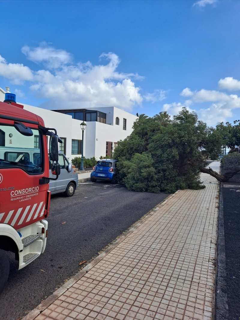 El temporal de viento que lleva sufriendo varios días Lanzarote tumbaba este martes un árbol de gran tamaño situado en la calle Las Tabaibas de Costa Teguise, haciéndolo caer sobre la calzada y bloqueando, en consecuencia, una de las vías.