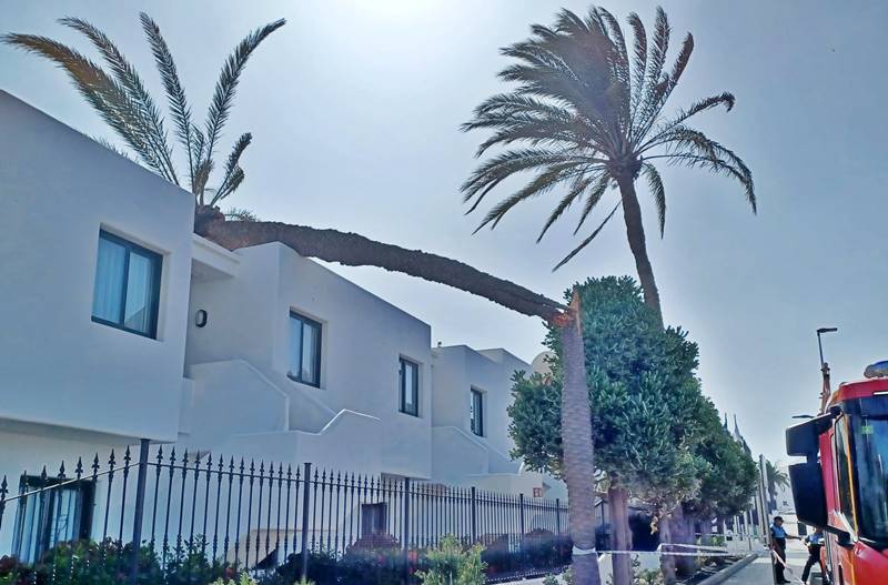 El viento "tumba" una palmera sobre unos apartamentos de Puerto del Carmen