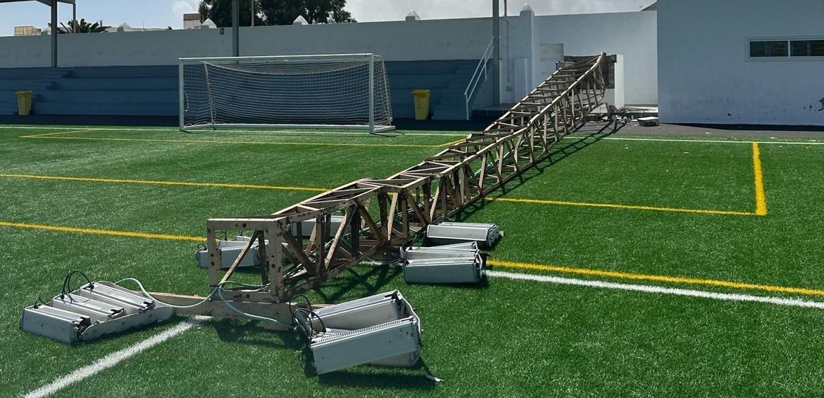 La gran fuerza del viento, que está generando la borrasca Nuria a su paso por las Islas Canarias, ha registrado esta tarde la caída de una de las torretas de iluminación en el Campo Municipal de Fútbol Agapito Reyes Viera, en el barrio de Altavista, en la capital de Lanzarote.