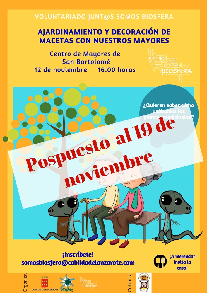 Mantener una comunidad informada, concienciada y con un alto nivel de participación e implicación en todos los niveles de la sociedad, tanto niños como adultos, es una de las metas de la Estrategia Lanzarote 2020. Para alcanzarla, el voluntariado Junt@s Somos Biosfera, dependientes de la Oficina de la Reserva de la Biosfera del Cabildo de Lanzarote, desarrollará el próximo 19 de noviembre el taller "Ajardinamiento y decoración de macetas con nuestros mayores" en San Bartolomé.