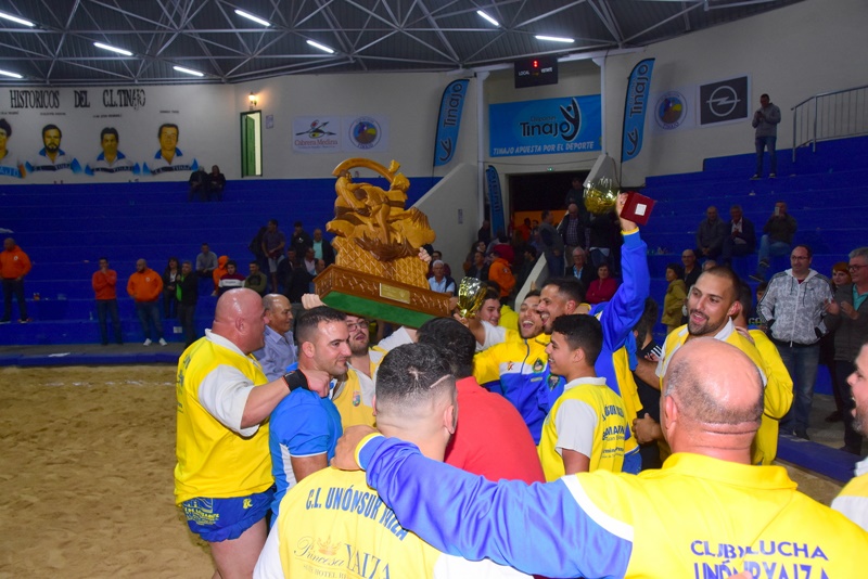 La familia de la lucha canaria de Yaiza redondea una semana de ensueño: el pasado miércoles recibió las llaves del nuevo terrero municipal de Uga de manos del alcalde, Óscar Noda, y este viernes el equipo grande del Club Unión Sur Yaiza revalidó el título de campeón de Liga de Lanzarote derrotando 12–11 al Unión Norte de Haría en finalísima celebrada en el terrero de Tinajo.