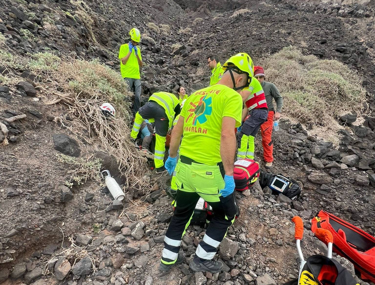El equipo de Emerlan, en coordinación con el Servicio de Urgencias Canario (SUC), accedió hasta el lugar del accidente, donde la víctima ya estaba siendo atendida por una ambulancia básica. Tras ser valorado, estabilizado y asistido, el herido fue trasladado mediante camilla percha hasta el aparcamiento de la playa, donde una ambulancia medicalizada lo llevó a un centro sanitario para una evaluación más detallada.