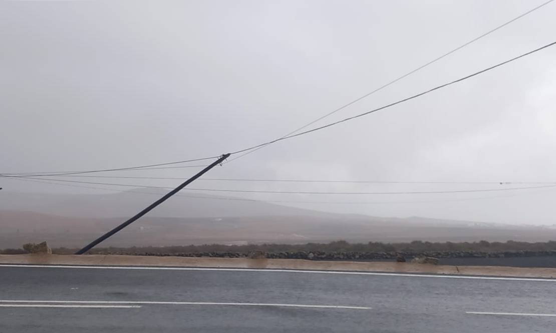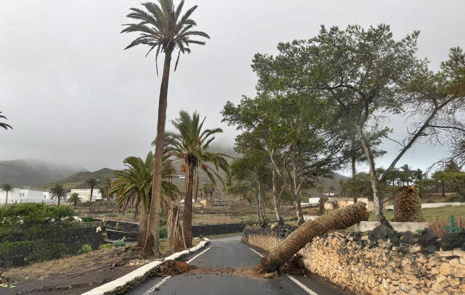 También en Teseguite, el viento ha tumbado postes de la luz de Telefónica. Mientras que Haría, una palmera caído cortando el paso en una de las calles del pueblo.