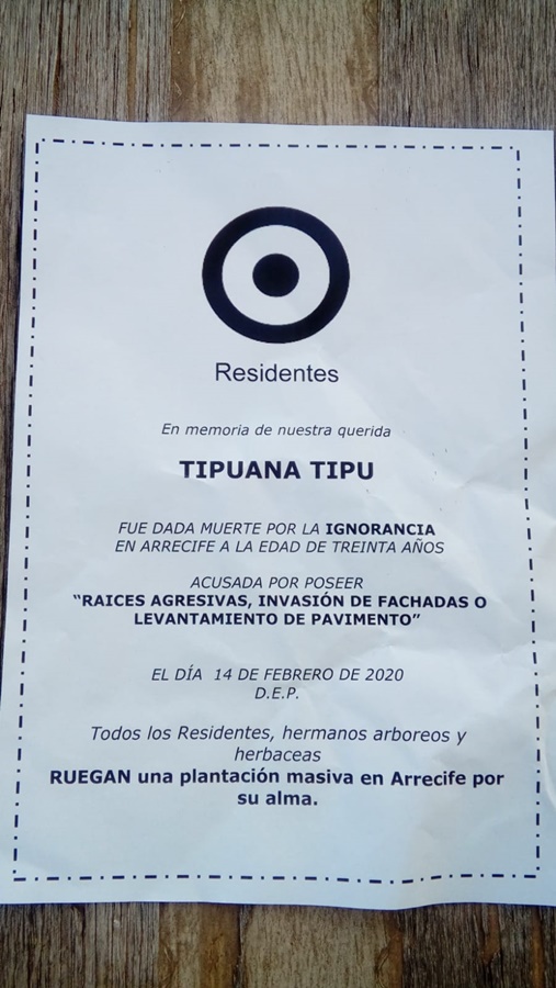 Con humor y bastante ironía los vecinos despiden a este árbol que "fue dado por la muerto por la ignorancia de Arrecife a la edad de 30 años". "Acusado por poseer raíces agresivas, invasión de fachadas o levantamiento del pavimento" murió "el día 14 de febrero de 2020. D.E.P.", destaca el epitafio, añadiendo que "todos los residentes, hermanos arbóreos y herbáceas ruegan una plantación masiva en Arrecife por su alma".