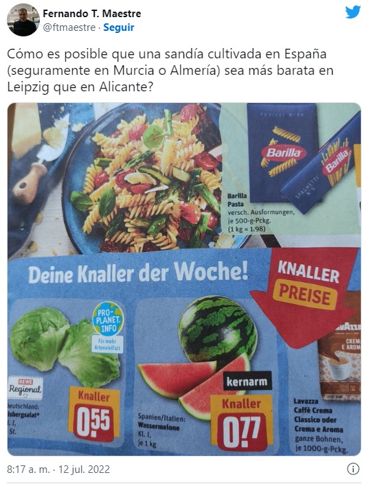 Hace unos días un tweet de Fernando T. Maestre, un prestigioso científico de la Universidad de Alicante, ha generado gran revuelo ya que se ha dado cuenta de que es más barato comprar sandías españolas en Alemania (Leizpig) que en nuestro propio país. Este mensaje vía Twitter ha hecho que gran parte de la población media se pregunte cómo es posible que ocurra esto.