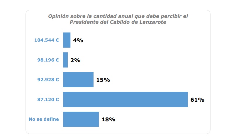 Betancort ofrecía 4 posibilidades: 87.000, 92.000, 98.000 o 104.000 euros. Con un total de 300 entrevistas realizadas a una muestra de población residente, mayor de 18 años, el 61% de la sociedad ha decidido que el sueldo del máximo representante insular debía ser de 87.120 euros; el sueldo más bajo de los ofrecidos.