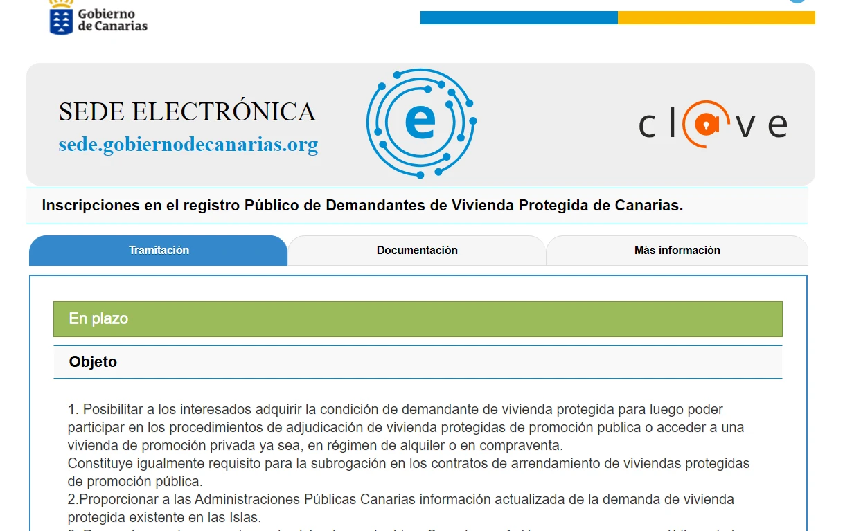 A través de la página del Gobierno de Canarias www.gobiernodecanarias.org, en esta pestaña que ven, orientada a trámites, les aparecerá una inscripción en el registro demandante de viviendas protegidas.