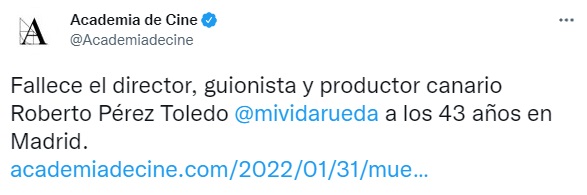 El cineasta tenía previsto participar este lunes en un encuentro en la Academia que incluía la exhibición de sus cortos 'Vuelco', 'Los gritones', 'RotosS', 'Sí a todo', 'Tris', 'Admirador secreto', 'Taras', 'Amor de autor', 'Siempre que lo cuento', 'Hidroalcohólico' y 'Antes de la erupción'.