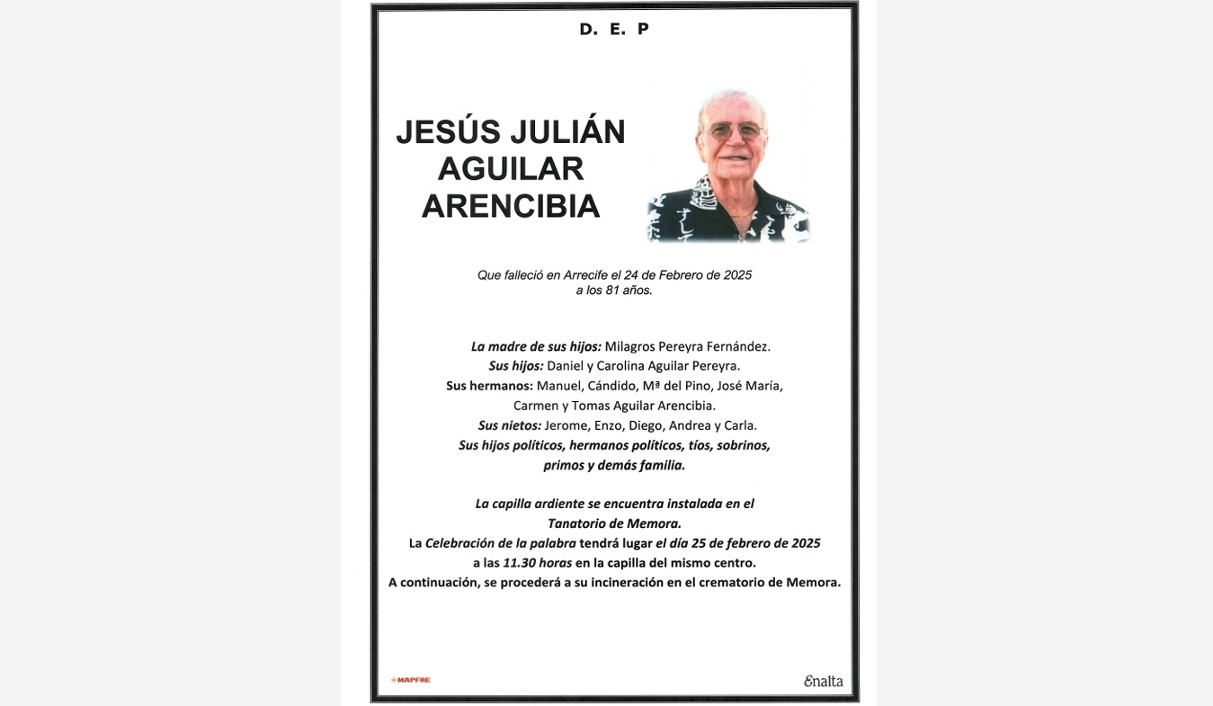 En el día de hoy fallecía, tras una dura enfermedad, el que fuera maestro muy conocido en Lanzarte, ya jubilado hace años, Jesús Julián Aguilar Arencibia, hijo del también popular maestro y pintor Cándido Aguilar.