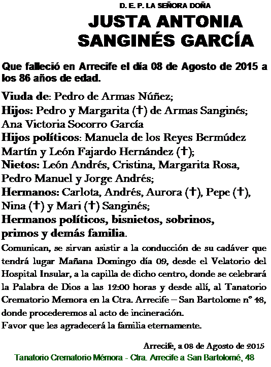 La familia comunica a todas sus amistades y seres queridos que mañana domingo 9 de agosto se conducirá su cadáver desde el Velatorio del Hospital Insular, a la capilla de dicho centro, donde se celebrará la Palabra de Dios, a las 12:00 horas y desde allí, al Tanatorio Crematorio Memora en la Ctra. Arrecife – San Bartolomé nº 48. Una vez allí, la familia procederá al acto de incineración.