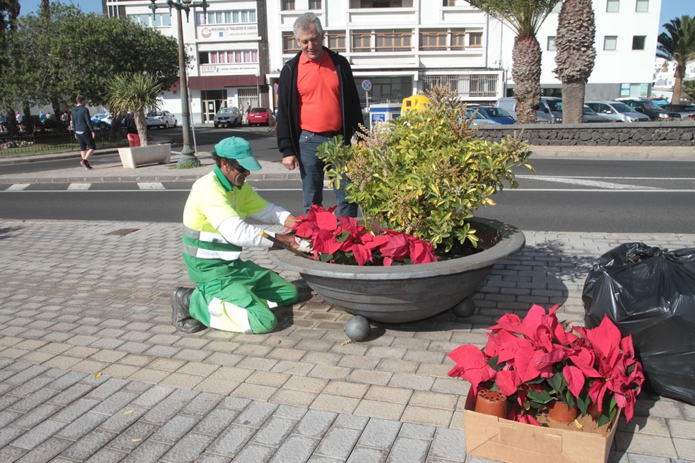 La capital de Lanzarote luce flores de Pascua en cada uno de los rincones de la ciudad. Más de una decena de operarios han colocado unas 8.000 plantas en distintos puntos de Arrecife.
