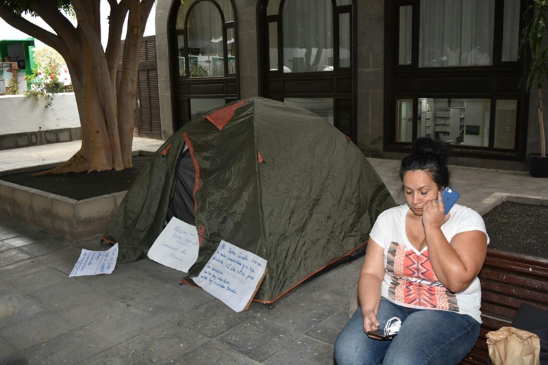 Gabriela, la mujer que inició este lunes una protesta ante su inminente desahucio, ya ha pasado la primera noche acampada frente al Ayuntamiento de Arrecife. En un vídeo publicado sobre las 6:30 horas por la concejal de Ganemos en la capital, Leticia Padilla, Gabriela reconoce haber pasado la noche "fatal, con mucho miedo". "Muy expuesta aquí en la calle tirada", confiesa.