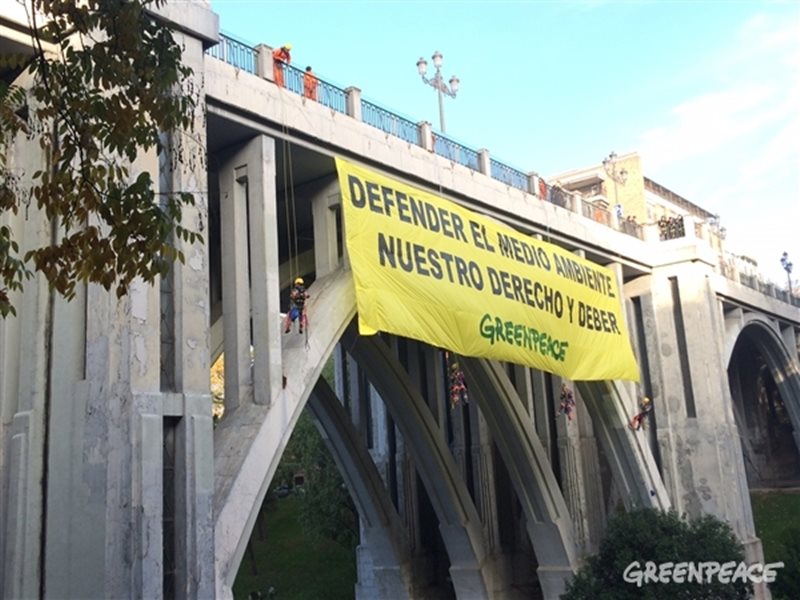 Coincidiendo con este anuncio, Greenpeace ha desplegado una pancarta de 126 metros cuadrados en Madrid con el lema “Defender el medio ambiente, nuestro derecho y deber”.