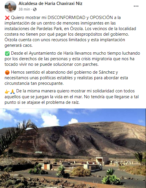 “Quiero mostrar mi DISCONFORMIDAD y OPOSICIÓN a la implantación de un centro de menores inmigrantes en las instalaciones de Pardelas Park, en Órzola. Los vecinos de la localidad costera no tienen por qué pagar los despropósitos del gobierno. Órzola cuenta con unos recursos limitados y esta implantación generará caos. Desde el Ayuntamiento de Haría llevamos mucho tiempo luchando por los derechos de las personas y esta crisis migratoria que nos ha tocado vivir no se puede solucionar con parches. Hemos sentido el abandono del gobierno de Sánchez y necesitamos unas políticas estables y realistas para abordar esta circunstancia tan preocupante. De la misma manera quiero mostrar mi solidaridad con todos aquellos que se juegan la vida en el mar. No tendría que llegarse a tal punto si se atajase el problema de raíz”.