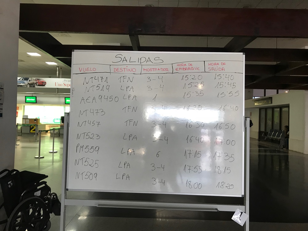 AENA no ha dudado en sacar la pizarra ante la posible rotura de la pantalla informativa de vuelos de la T2 y poner del puño y letra de los propios trabajadores las horas de salida, embarque y si hay retraso o no en los vuelos interinusulares, que además ahora se ha ampliado la oferta con la activdad de Binter, CanaryFly y Air Europa, por lo que son más vuelos a escribir.