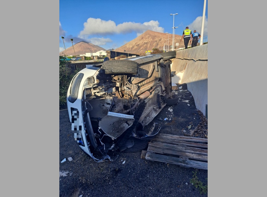 Impactante era la imagen que ofrecía este miércoles un vehículo tras caer a una altura de dos metros en San Bartolomé.
