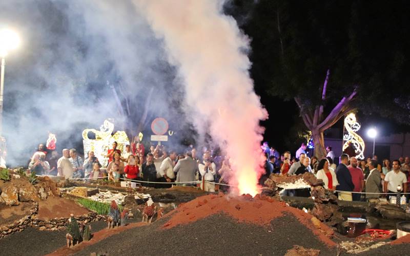 El portal simula la columna de emisión de gases, el fuego y lava del volcán, acompañado de luces y sonido, efectos especiales que los visitantes podemos apreciar cada tres minutos. Cuando el alcalde de Yaiza, Óscar Noda, pulsó este viernes el botón para iluminar el belén y activar por primera vez el montaje de cara al público, la asistencia se mostró sorprendida para reaccionar de inmediato con un sonoro aplauso, el mejor reconocimiento al trabajo intenso de los tres belenistas que empezaron a construir el portal desde mediados de octubre con jornadas de siete horas diarias.