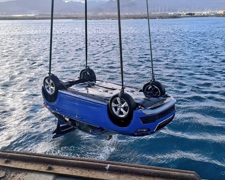 Estas imágenes fueron tomadas en la jornada de ayer en el Puerto de Arinaga, en Gran Canaria. En ellas se ve cómo un vehículo tuvo que ser alzado por una grúa después que caer al agua.
