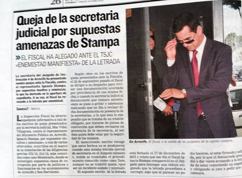 Inspección Fiscal ha abierto un expediente informativo tras los escritos de queja presentados por la secretaria del Juzgado de Instrucción número 4 de Arrecife, Mar Vidal Villagrasa, contra el representante del Ministerio Público en la capital, Ignacio Stampa, por presuntos "insultos y amenazas" a raíz de varios altercados ocurridos en el marco de la tramitación de las diligencias previas del caso Montecarlo, según publica Canarias 7.