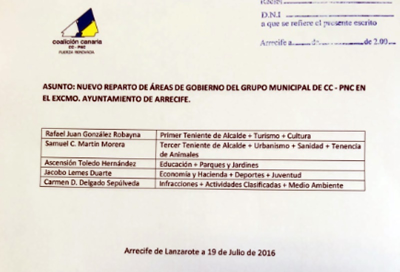 CC ha llevado a cabo un nuevo reparto de áreas de gobierno entre sus concejales de Arrecife, que ya ha sido aprobado por la alcaldesa. De esta forma, Jacobo Lemes asume a partir de ahora Economía y Hacienda, concejalía que hasta el momento estaba en manos de Samuel Martín.