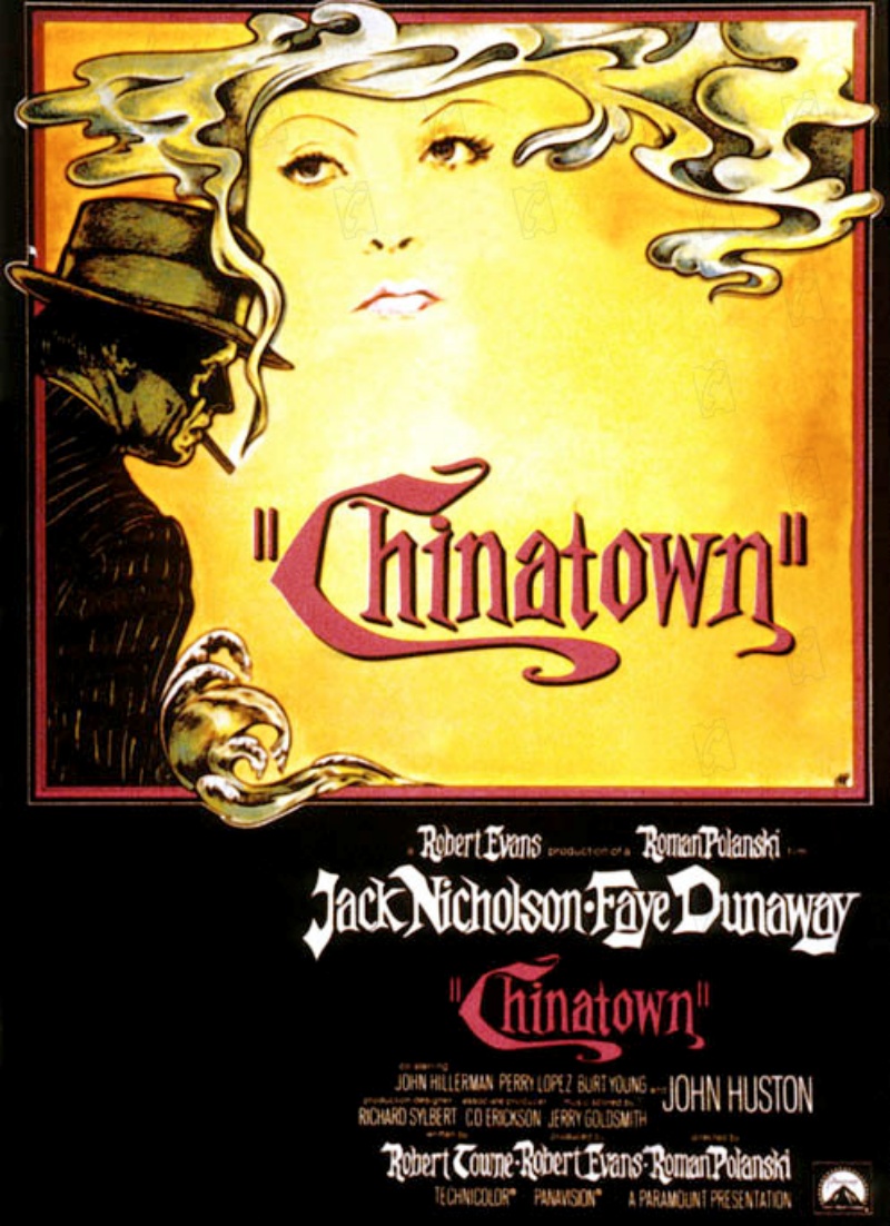 Chinatown es una película genial tipos duros y chicas malas, giros de historia, Jack Nicholson contenido en su excentricismo, con la nariz rota, y un papel que le valdría muchos premios. Y Fane Dunaway en el papel de mujer oscura que esconde un misterio a resolver. Como suele pasar la conjunción de un gran director y dos actores como Jack Nicholson y Fane Dunaway derivan en esta magnífica película.