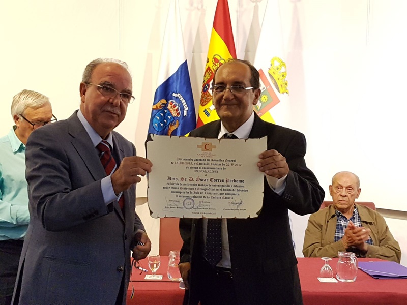 Lanzarote estrena memoristas de honor. En efecto, este jueves tuvo lugar el acto de entrega de la distinción como ‘Memorialistas de Lanzarote 2017’ a Jesús Perdomo y Óscar Torres por la Junta de Cronistas Oficiales de Canarias, en la Sala de Exposiciones El Aljibe, después de que esta ratificara el acuerdo adoptado por los cronistas de Lanzarote.
