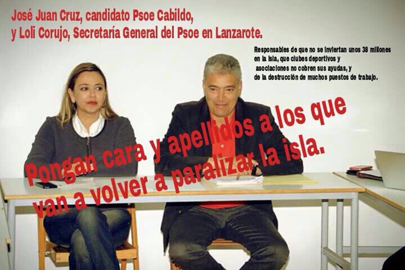Tanto por Whatasapp como por redes sociales como Facebook ha circulado este fin de semana la imagen de José Juan Cruz y Dolores Corujo señalados como culpables de la actual inestabilidad y de la posibilidad de que los presupuestos se queden sin ser aprobados y se pierdan más de 30 millones de euros en inversiones y subvenciones para las ONGs y colectivos deportivos y culturales.
