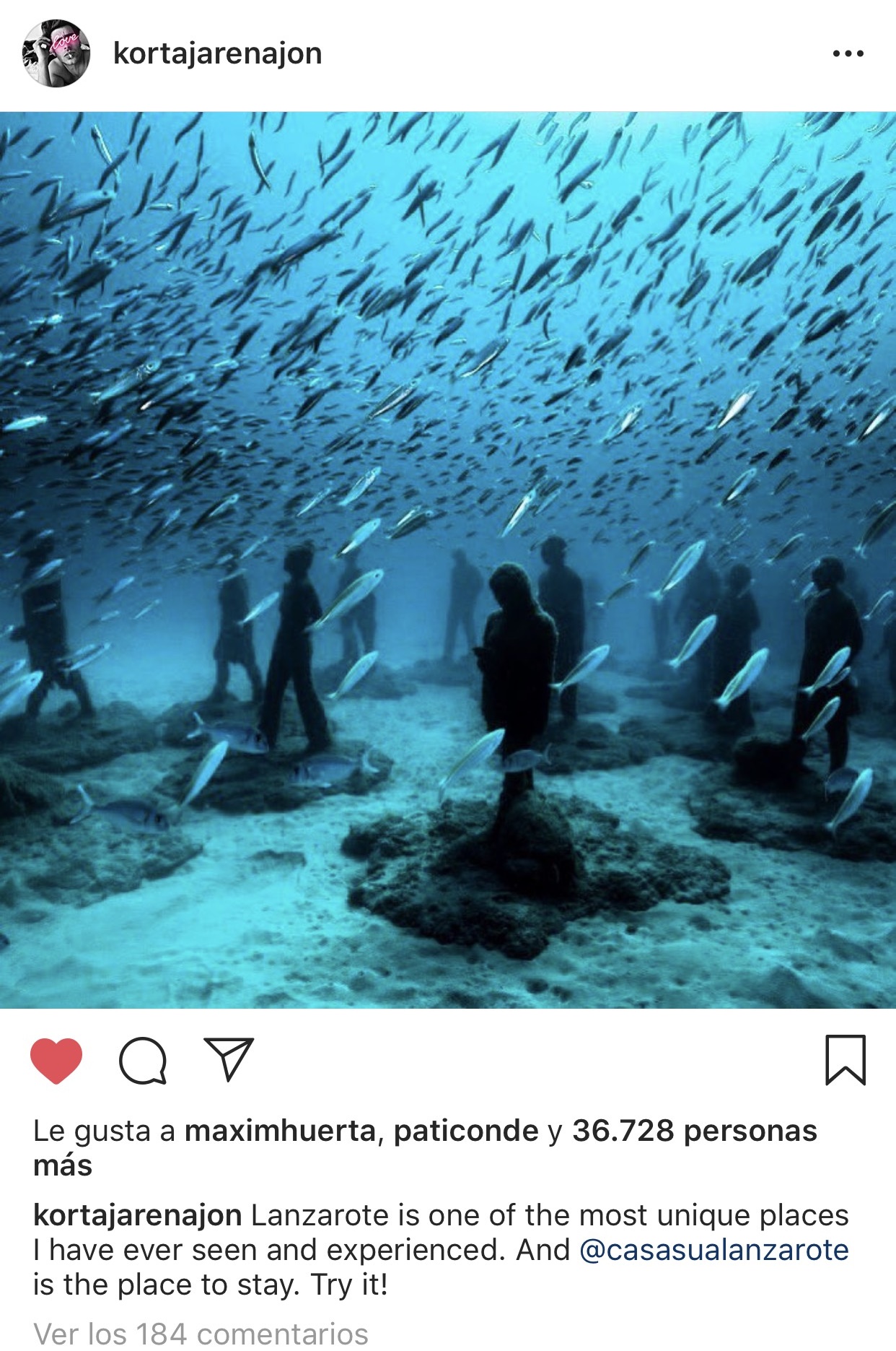 Con la foto donde se puede ver parte del Museo Atlántico con las peculiares figuras sumergidas, rodeadas de muchos peces en un azul intenso del mar, acompaña un texto que dice "Lanzarote es uno de los lugares más únicos que he visto y experimentado".