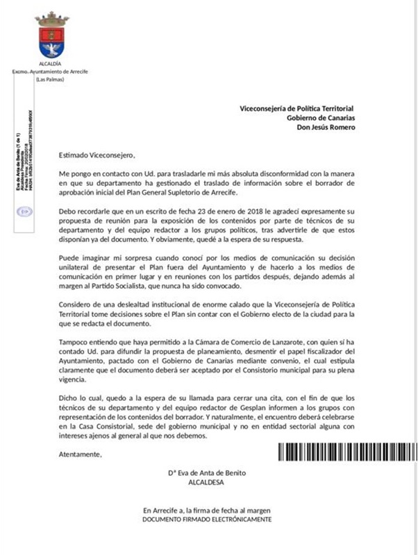 El citado escrito señala que "el día nueve del pasado mes de enero, ante la imposibilidad de localizarle telefónicamente, la alcaldesa dirigió un escrito al viceconsejero de Política Territorial solicitando información "urgente y precisa" sobre el Plan General de Arrecife, recordándole que en febrero de 2016 se había comprometido a tener listo el documento en el mes de mayo de ese mismo año a pesar de lo cual, el Ayuntamiento sigue sin tener noticias del planeamiento".