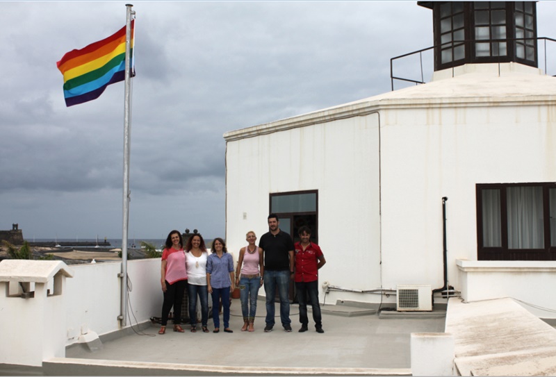 La alcaldesa de Arrecife, Eva de Anta, junto a ediles del Partido Socialista, Coalición Canaria, Podemos y Ciudadanos, posaron bajo la enseña multicolor como muestra de respeto hacia la lucha y reivindicaciones de las personas gays, lesbianas, transexuales y bisexuales.