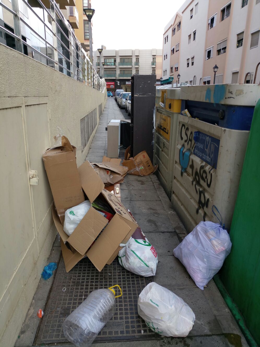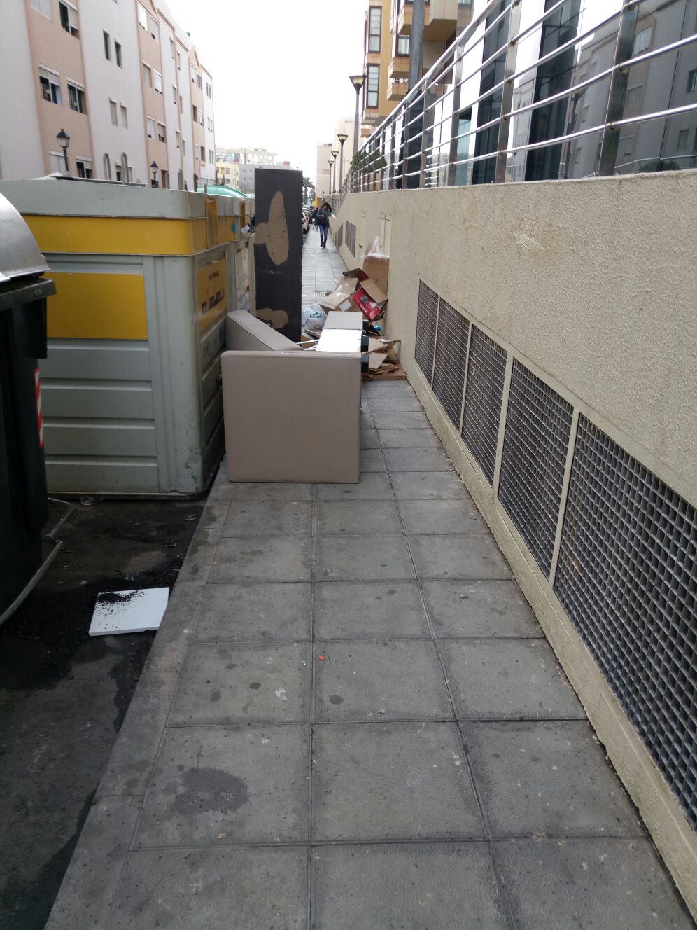 La basura se adueña de las aceras de Arrecife imposibilitando el paso de los vecinos de la zona del edificio "Jardín de Triana" y aledaños. Testigos presenciales denuncian que las personas en silla de ruedas se han visto afectadas a la hora de pasar por la acera, igual que ocurrió con un madre que trataba de pasar con su carrito de bebé.