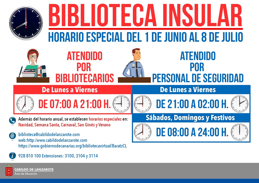 El Cabildo de Lanzarote, a través de su Consejería de Educación, gestionada por Carmen Rosa Márquez, informa que a partir de hoy, viernes 1 de junio, y hasta el próximo 8 de julio, la Biblioteca Insular ampliará su horario de atención al público.