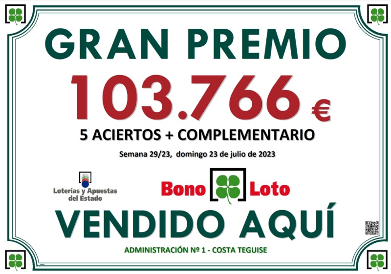 El pasado 23 de julio fue un día especialmente feliz para un lanzaroteño, y es que, al margen de sus preferencias políticas, él sí resultó ganador. Concretamente se llevó un premio en la Bonoloto de cinco aciertos más el complementario. El importe del premio asciende a 103.766,79 euros.