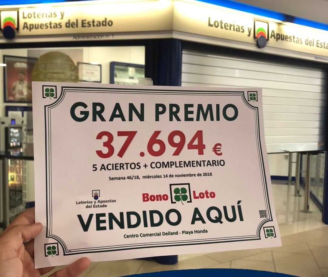 El sorteo de la Bonoloto de la ONCE dejaba ayer miércoles 14 de noviembre, un premio de 37.694,34 euros con un boleto acertante de segunda categoría (cinco aciertos y Complementario) validado en la Administración de Loterías número 1 del municipio lanzaroteño de San Bartolomé, correspondiente al Centro Comercial Deiland.