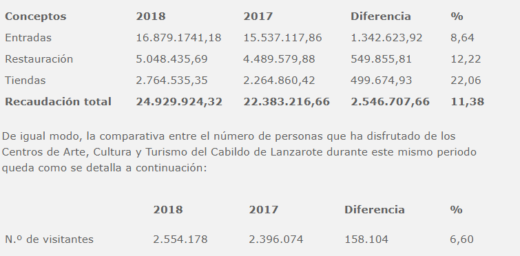 Lanzarote, 12 de noviembre de 2018.- La recaudación de los Centros de Arte, Cultura y Turismo alcanzó los 2.539.718,88 euros el pasado octubre, lo que supuso un descenso del 5,15% con respecto al mismo mes del pasado año.