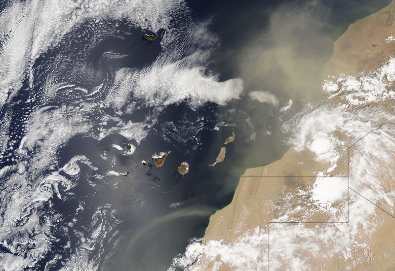 La imagen, captada por el satélite de la Nasa Modis Terra muestra cómo el polvo en suspensión se acercaba hacia las Islas Canarias