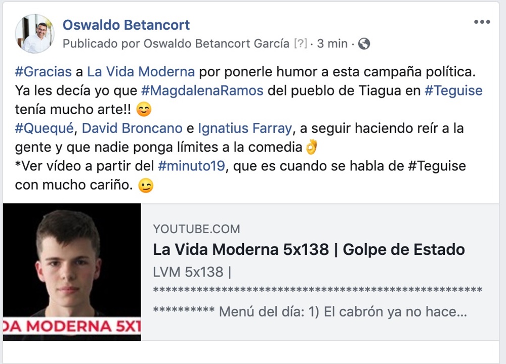 En el programa de humor que se emite por radio y también por su canal de Youtube, presentado y dirigido por David Broncano, que cuenta con más de 300.000 suscriptores, se habló de la canción que le dedica la artista y vecina de Tiagua, Magdalena Ramos a Oswaldo Betancort, como recursos de campaña curiosa dentro de esta carrera electoral del 26 de mayo.