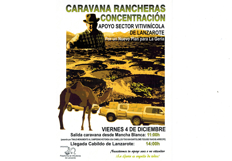 La caravana ranchera y concentración para apoyar al sector vitivinícola de Lanzarote calienta motores convocando a los medios de comunicación el próximo miércoles a las 12 horas en el Monumento al Campesino. Allí los organizadores explicarán los motivos de esta movilización en favor del agro insular y los detalles de la caravana que saldrá el viernes a las 11 de la mañana desde Mancha Blanca para llegar a las 14 horas al Cabildo de Lanzarote donde se leerá probablemente un manifiesto.