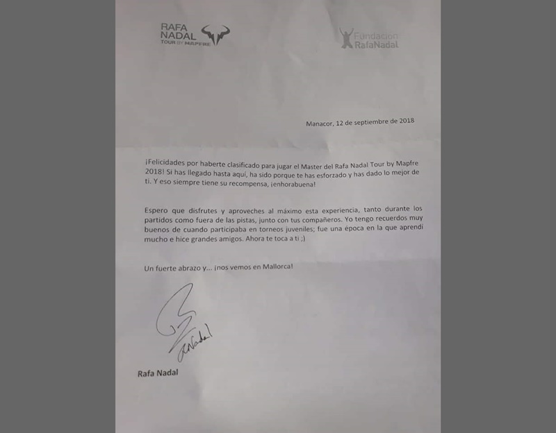 Nadal animaba además a la lanzaroteña a disfrutar de la experiencia, tanto dentro, como fuera de los partidos. “Yo tengo recuerdos muy buenos de cuando participaba en torneos juveniles. Fue una época en la que aprendí mucho e hice grandes amigos. Ahora te toca a ti”, afirma en la carta el tenista.