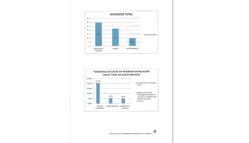 La CEL recalca también “la necesidad de que los ayuntamientos inviertan más porque, aun entendiendo las consecuencias de la crisis económica, los porcentajes de inversión con respecto a los presupuestos del gasto son muy pequeños”. “A excepción del Cabildo de Lanzarote, que destina el 20% el resto de las administraciones locales dedican menos del 10% de su gasto total a inversiones, llegando algunos a no destinar casi recursos a la inversión como Tinajo que apenas tiene previsto dedicarle un 2,5%, o Tías que se queda en un 3,41%, Haría en un 3,5% y Yaiza en un 3,91%. En el caso de San Bartolomé, se destina el 6,71% y Arrecife y Teguise un 9% y un 9,27%, respectivamente”, apuntan.
