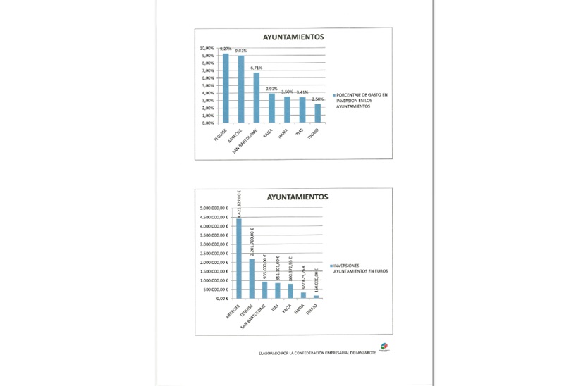 El Ayuntamiento que más inversión global, 4.423.827 euros, y segundo mayor porcentaje del presupuesto, 9%, destina a inversiones es el Ayuntamiento de Arrecife, seguido por Teguise, con un montante de 2.201.700 euros, que representan el 9,27% del gasto total municipal. En tercer lugar está San Bartolomé con 935.000 euros y un 6,71% del presupuesto. Tías ocupa el cuarto puesto en inversión global con 851.101 y el sexto en porcentaje con 3,41% y Yaiza obtiene el quinto en inversión total con 800.372 euros y el cuarto en porcentaje con un 3,91% del total de su gasto. Haría con 322.625 euros es la penúltima en montante total y la quinta en porcentaje inversor (3,5%) y Tinajo cierra la clasificación, sin presupuesto aprobado aún pero con una previsión de inversión de unos 150.000 euros lo que representa aproximadamente un 2,5 % del presupuesto que será muy similar al del ejercicio pasado.