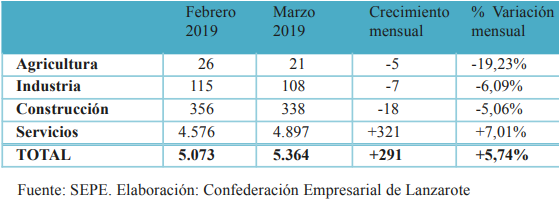 Arrecife: En un informe elaborado por la Confederación Empresarial de Lanzarote CEL, a partir de los datos publicados por el Servicio Canario de Empleo, se congratula del crecimiento de las contrataciones laborales experimentado durante el último mes de marzo, y que ascienden a 5.364 (291 contratos más) lo que supone un incremento del 5,74% respecto del mes anterior. Este dato contrasta con la evolución seguida por el desempleo en el mismo período, que se elevó en 180 personas desempleadas, lo que implica un 1,63 % más, en parte explicado por el aumento del número de personas desempleadas sin actividad económica anterior, que creció en un 4,58%.