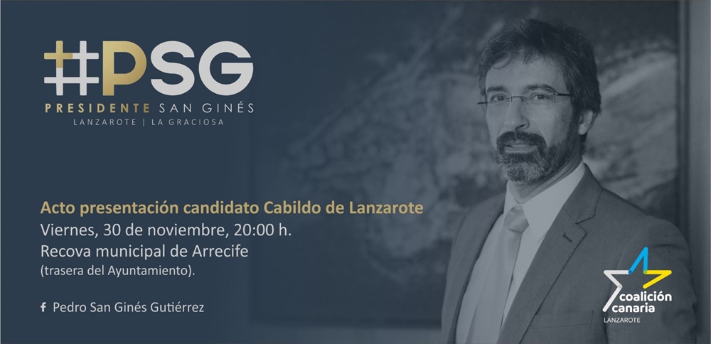 El acto será mañana a las 20.00 horas en la Recova de Arrecife, en la trasera del Ayuntamiento y San Ginés estará arropado por la cúpula del partido en Canarias, contando con la asistencia del presidente del Gobierno, Fernando Clavijo, la diputada Ana Oramas y el secretario de CC en Fuerventura, Mario Cabrera, además de otros cargos destacados como el vicepresidente del Parlamento, David de la Hoz, o la lidereza nacionalista en Lanzarote, Migdalia Machín.