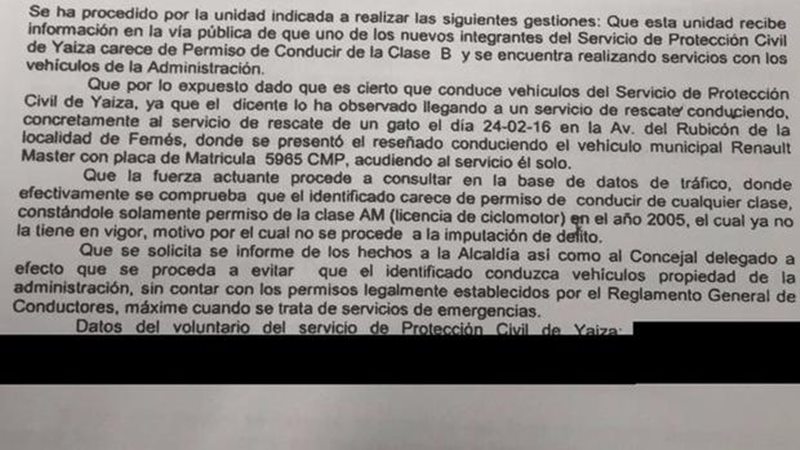 Según la información de ABC, los miembros del cuerpo municipal habían recibido "información en la vía pública" de que este integrante de Protección Civil de Yaiza carecía de permiso de conducir, por lo que proceden a su identificación y posterior búsqueda en la base de datos de Tráfico, "donde efectivamente se comprueba que el identificado carece de permiso de conducir de cualquier clase".