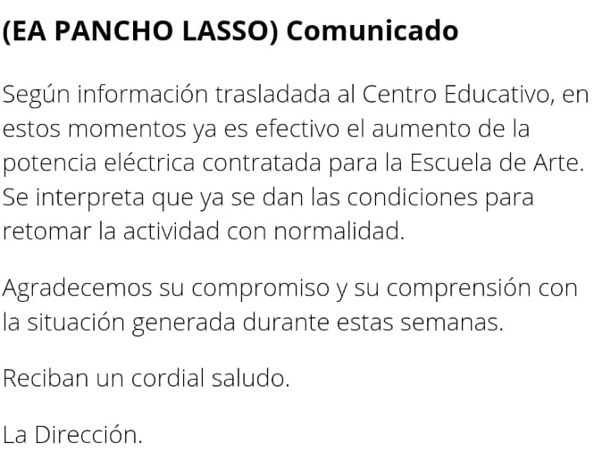 La Dirección de la Escuela de Artes y Oficios Pancho Lasso ha comunicado a profesores y alumnos que el problema que arrastraban desde el inicio de curso con la luz, se ha solucionado.
